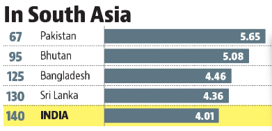 - या यादीत भारत १५६ देशाच्या यादीत १४० आहे. (मागील वर्षी १३३ होता.)